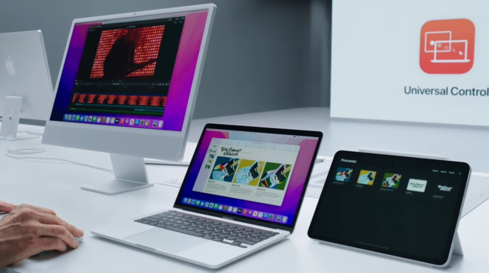 유니버설 컨트롤은 아이클라우드에 로그인된 맥, 아이패드 등 여러대를 USB 또는 무선으로 연결하면 하나의 키보드, 마우스로 텍스트를 입력하고 마우스 커서를 움직이고 문서, 이미지, 미디어 파일을 이동할 수 있습니다. 맥과 아이패드, 맥북을 연결하여 하나의 키보드, 마우스로 조작이 가능합니다.