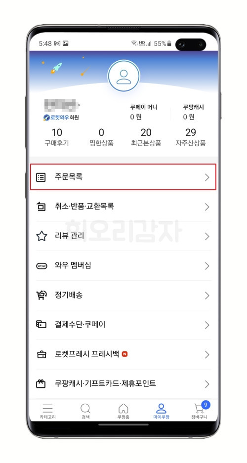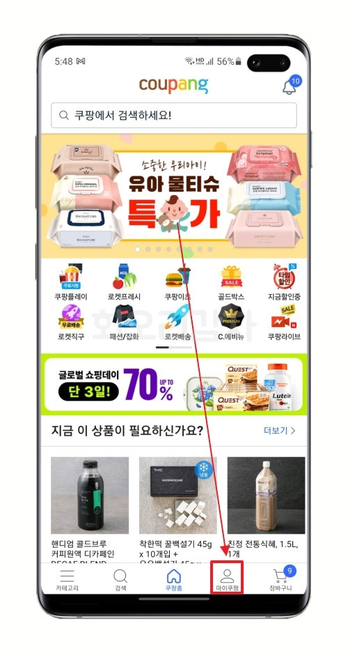 쿠팡에 접속했다면 송장 번호를 확인하기 위해 오른쪽 하단에 마이쿠팡을 선택합니다. 마이 쿠팡 메뉴에서는 상품에 대한 조회, 취소, 반품과 결제수단 등을 관리하는 페이지 입니다.