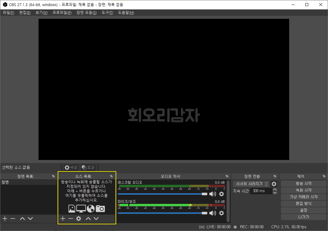 방송과 녹화를 위한 기본 설정이 완료되었다면 방송에 내보낼 비디오 소스 중 하나인 화면을 캡처하는 방법에 대해 알아보도록 하겠습니다. 이번에 알려드리는 곳에서 화면 캡처는 물론이고 별도의 캠이 있다면 캠도 추가할 수 있습니다.