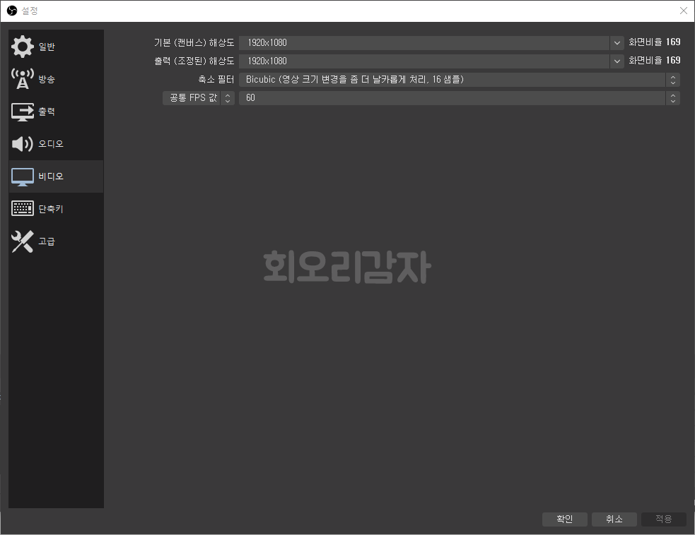 비디오에 대한 설정 입니다. 기본 캔버스 해상도와 출력 해상도 모두 1920x1080으로 설정해 줍니다. 출력 해상도는 송출되는 해상도를 말하고 기본(캔버스) 해상도는 OBS 프로그램에서 보이는 해상도를 말합니다. 공통 FPS값은 60으로 설정해 줍니다.