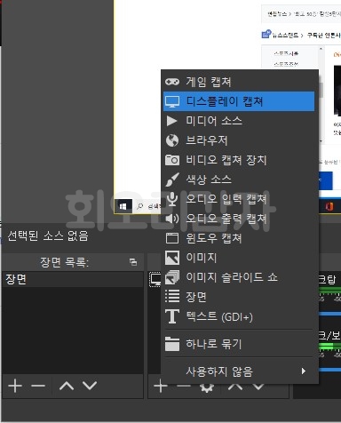 +버튼을 누르시면 팝업 메뉴가 나타납니다. 정말 여러 가지 소스를 선택할 수 있는데 하나의 모니터 전체를 캡처 하시려면 디스플레이 캡쳐를 선택해 줍니다.