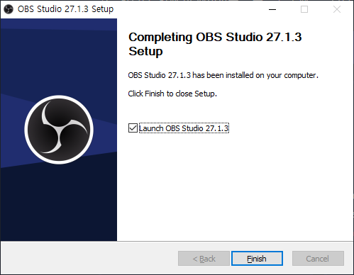 아제 OBS Studio 설치가 완료되었습니다. Launch OBS Studio 체크박스가 체크돼있는 체로 Finish를 누르면 바로 프로그램이 실행됩니다.
