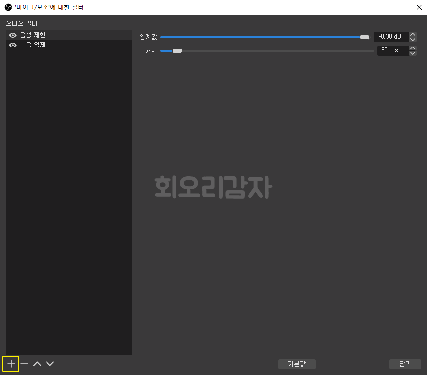 팝업 된 설정 창 왼쪽 하단을 보시면 +버튼이 보이는데 이곳을 눌러 필터를 추가해 줄 수 있습니다. 소음 억제와 음성 제한 두 가지를 추가해 줍니다.