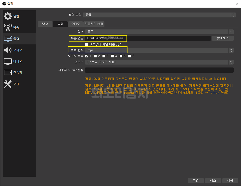 녹화 형식은 mkv나 mp4와 같은 포맷을 지정할 수 있습니다. mkv 파일로 녹화할 경우 녹화 중 PC에 이상이 생기더라도 그동안 녹화된 파일은 복구가 가능합니다. 하지만 mp4 파일로 녹화 시 중간에 PC에 문제가 생기면 그동안 녹화됐던 파일이 날아가게 됩니다. 하지만 프리미어 같은 프로그램에서 mkv 파일을 바로 사용할 수 없어 인코딩을 진행해야 됩니다. mp4로 선택하여 진행하시거나 별도로 인코딩을 진행할 에정이라면 mkv로 확장자를 지정하시면 됩니다.