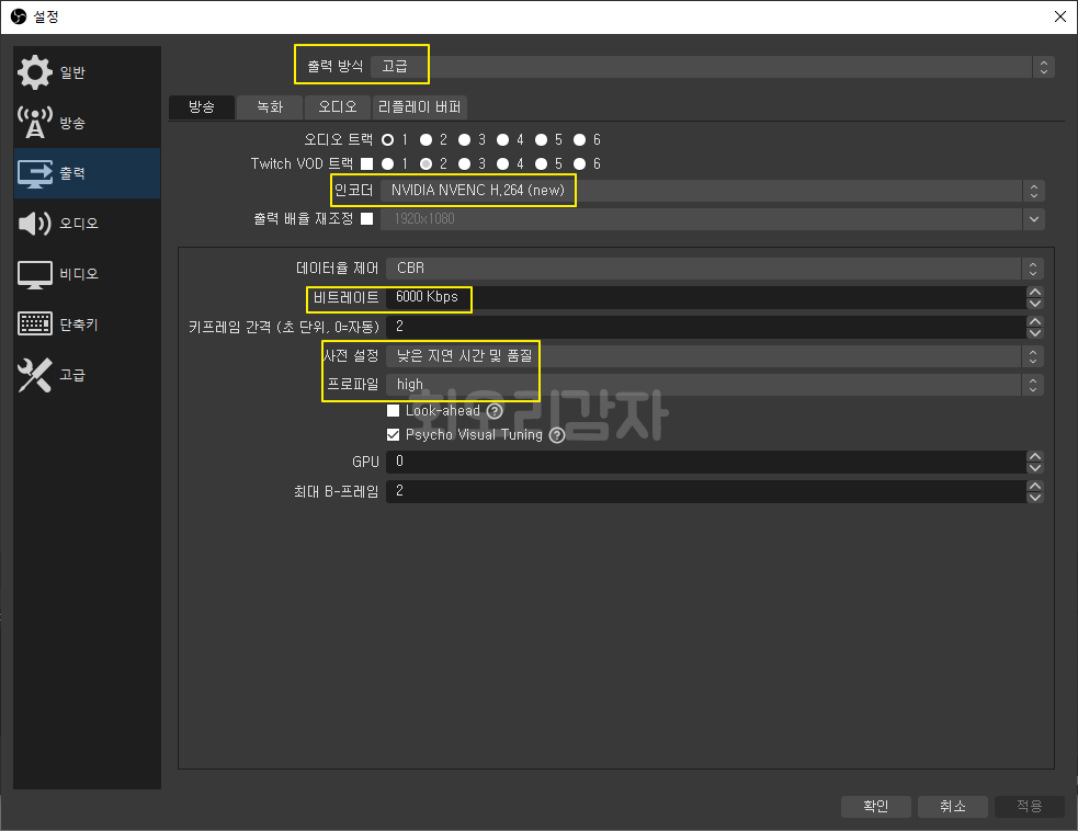 방송출력 설정을 하는 탭입니다. 출력 방식을 고급으로 변경해 주시면 위와 같은 화면이 나올 것입니다.