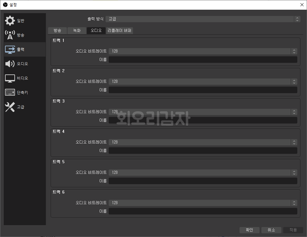 녹화되는 오디오에 대한 품질을 설정하는 곳인데 오디오 비트레이트를 모두 128로 설정해 줍니다.
