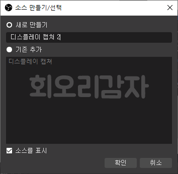 그럼 소스 만들기/선택 파업창이 나타나는데 캡쳐 장치의 이름을 입력하고 확인을 눌러 줍니다.