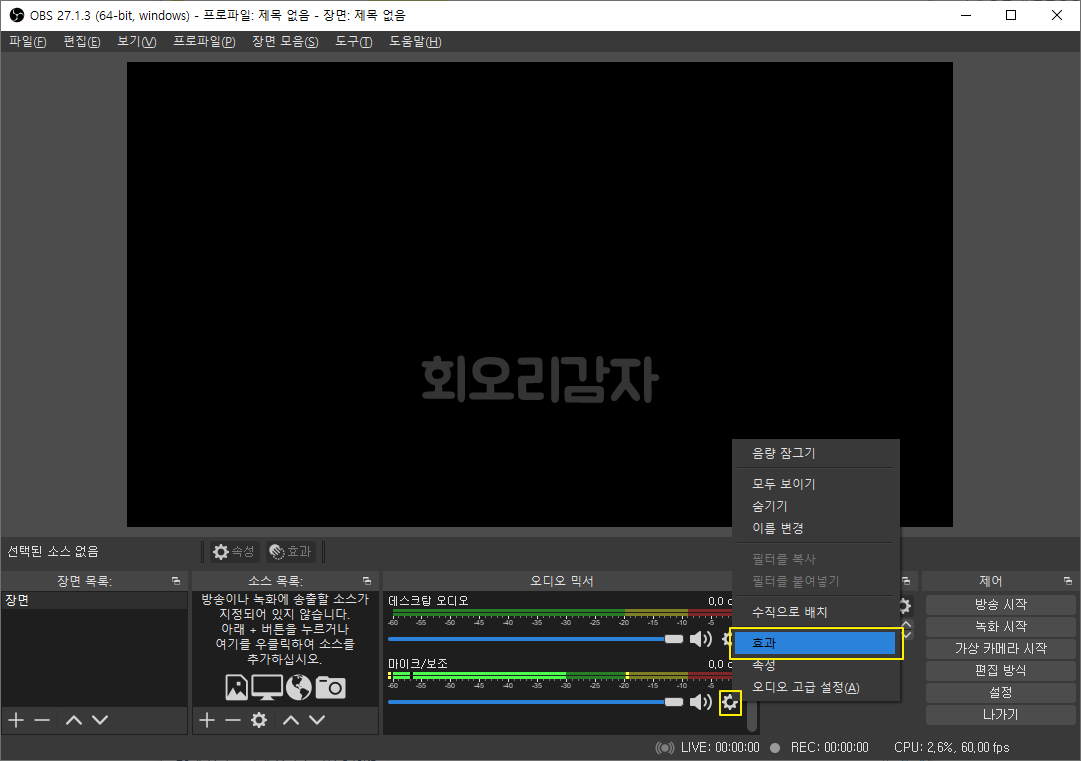 하단에 보시면 오디오를 설정하는 영역이 있습니다. 여기에서 마이크/보조 영역에 보시면 오른쪽 아래 톱니바퀴 모양의 아이콘이 있는데 이곳을 클릭해 줍니다. 그럼 팝업 메뉴가 나타나게 되는데 [효과]를 선택해 줍니다.