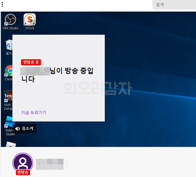 트위치에 들어가서 내 채널 상태를 보시면 방송 중이라는 문구와 현재 방송되고 있는 화면을 볼 수 있습니다.