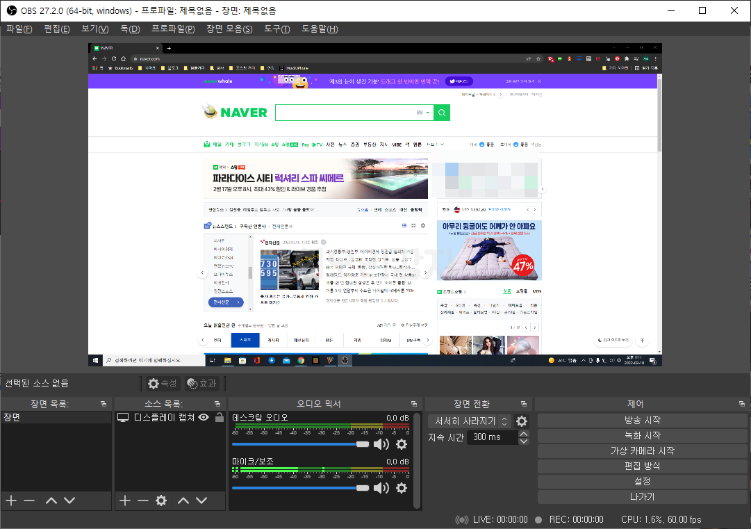 그럼 위와 같이 소스에 디스플레이 캡처가 추가가 되고 화면을 캡처한 결과가 캔버스에 나타나게 됩니다. 여기에 소스를 계속 추가해서 캠도 추가하고 게임도 하고 있다면 게임을 실행시켜 게임을 하고 있는 창도 추가할 수 있습니다.