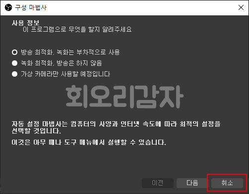 OBS 소프트웨어가 실행됐다면 위와 같은 화면이 나올 것입니다. 취소를 눌러 마법사 실행을 종료합니다.