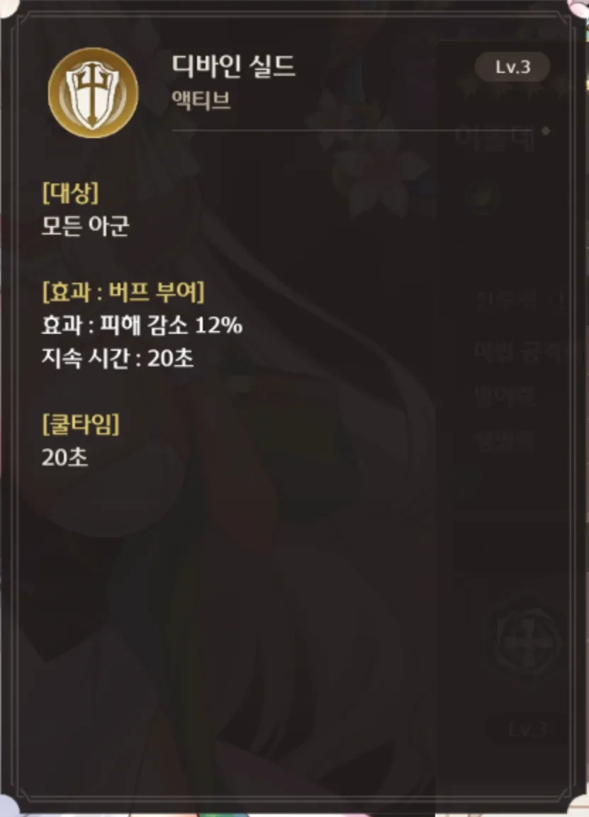 버프 중에 가장 어이 없음. 얘는 따닥도 안 쓰고 하는데 파티원이 [디바인 실드]를 한명이라도 달고있으면 안씀. 디바인 실드를 넣었는데 어떻게 디바인 실드가 삭제 안되냐? 할 수 있는데 실험하면서 본건데 이 게임 용가리 기준 버프 삭제가 각 캐릭별로 1개씩 삭제하는 매커니즘임 그래서 디바인 실드가 들어갔는데 중간에 다른 버프가 들어가서 디바인 실드가 삭제되야하는 위치에 다른 버프로 밀리게되면 그 버프가 대신 지워지고 디바인 실드가 남게됨 ㅋㅋㅋ 이러면 루아 카드로 스킬 초기화가 되어도 사용을 안하고 벙찌고 있음.