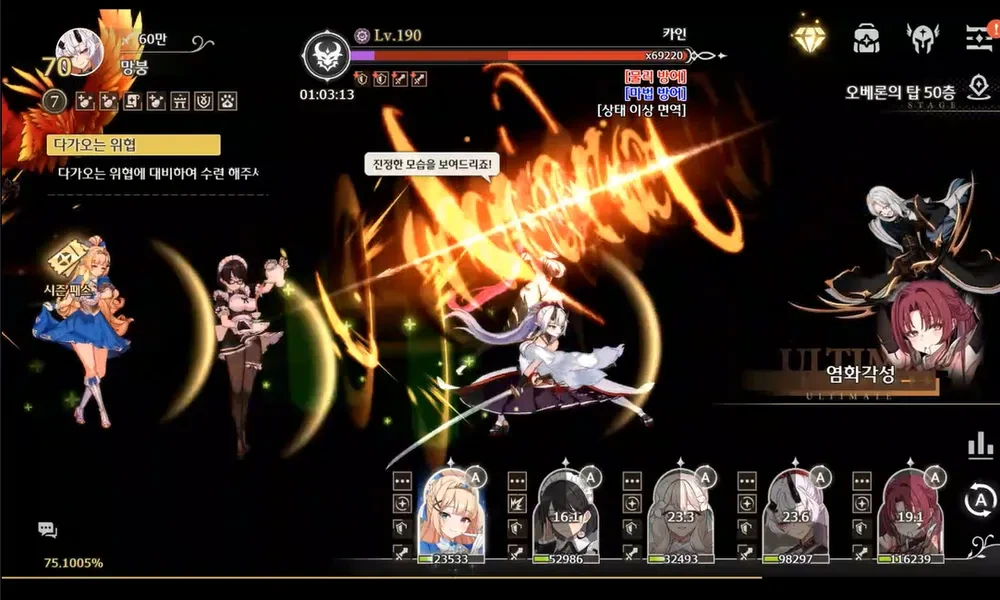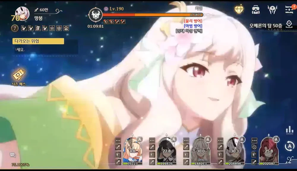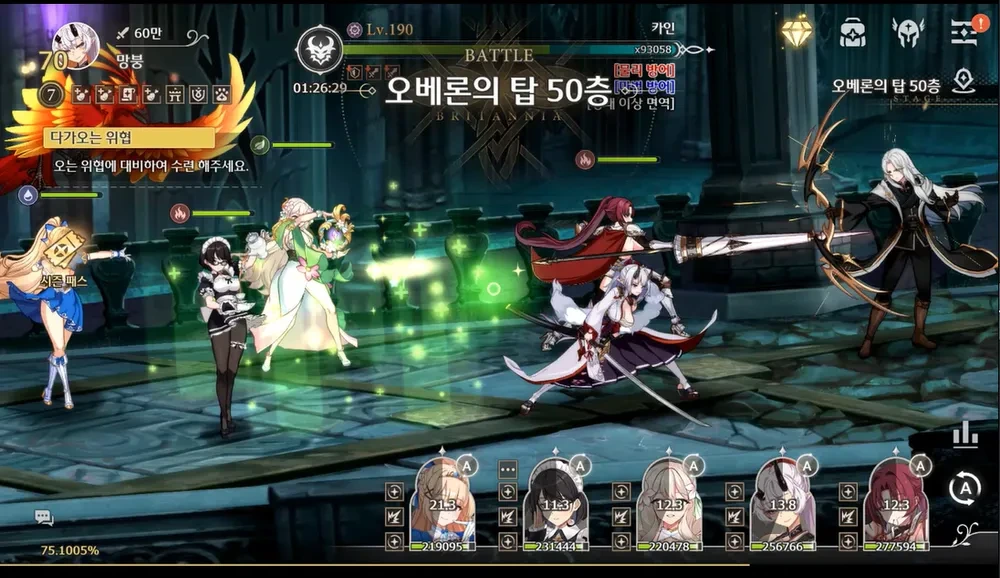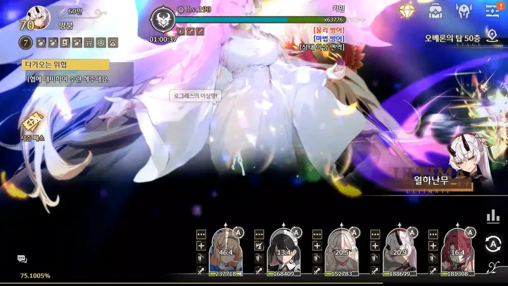 두번째 카인 궁을 쳐맞고 란 궁이 나갔는데 리아 궁으로 펌핑 된 애들의 체력버프로 약 30초즈음에 애들이 살아있으면, 0초까지 또 다른 위험 패턴은 존재하지 않는다. 46층 처럼 공버프를 쓴다든가 갑자기 뜬금 억까 패턴을 갈기진 않는다.