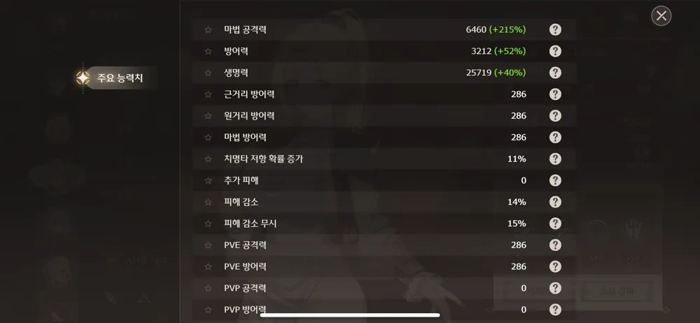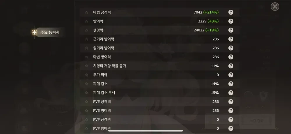 비교예시를 위해 이게 내 에스메랄다 세부 스탯창임. 에스메랄다가 각성으로 공생방 +40%에 특성에 이졸데에 비해 공격력 17.5퍼가 더 붙어있어서 56-(40+17.5)=-1.5퍼 나오는게 맞아서 소숫점 빼고 나면 딱 맞음.