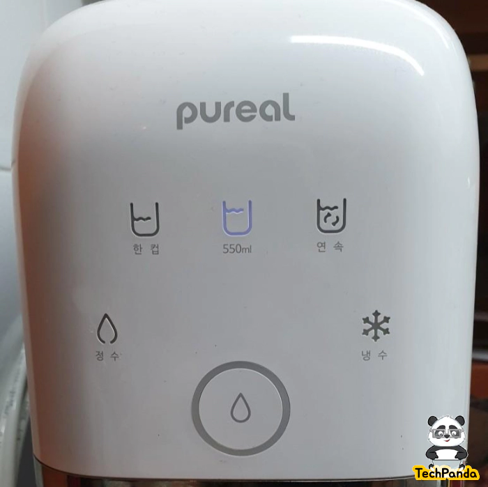 전면부에 있는 버튼은 물의 양을 조절할 수 있는 버튼과 일반 정수와 냉수를 선택할 수 있는 버튼으로 되어 있다. 위쪽에서 양을 선택하고 아래쪽에서 정수/냉수를 선택하고 가운데 동그란 버튼을 누르면 물이 나오기 시작한다.