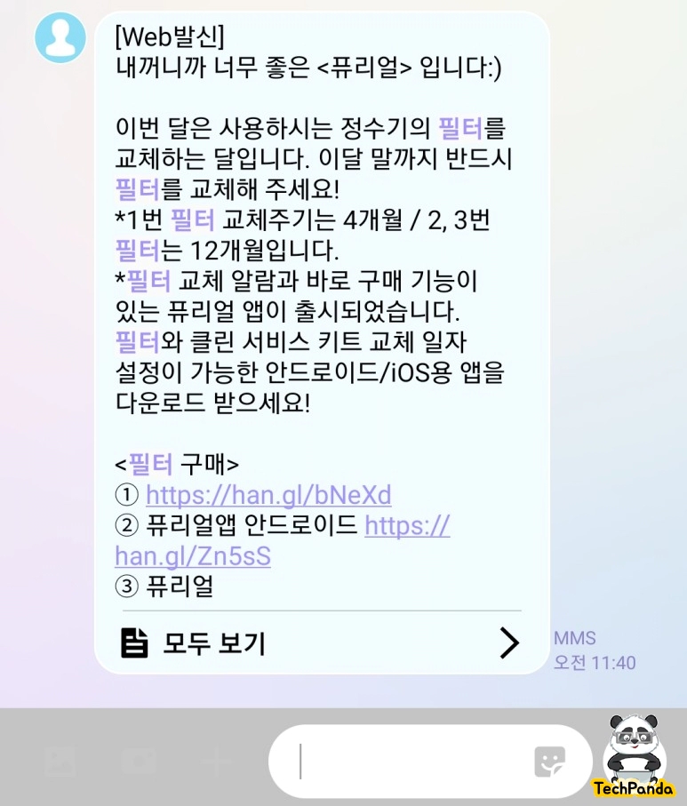 퓨리얼 정수기가 좋은 이유 중에 하나가 필터 교체 시기가 되면 퓨리얼 본사로부터 필터 교체 시기가 되었다고 문자가 오기 때문에 별도로 기억한다거나 메모할 필요 없이 문자가 오면 교체해 주시면 됩니다.