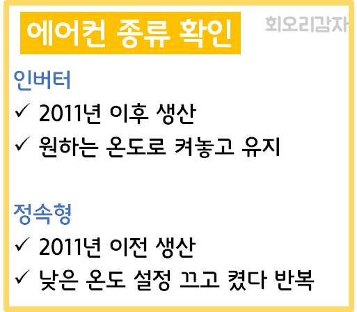 인버터인지 확인하는 방법은 2011년 이후 생산 판매되는 에어컨은 인버터형이 대부분이지만 2010년까지는 대부분 정속형 에어컨이다.