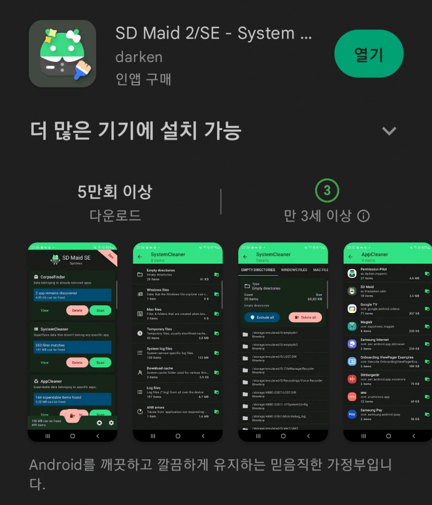 앱 캐시 지워주는 앱은 여러개 있는데 본인이 사용하는 앱은 SD Maid 2/SE 라는 앱임 (플레이스토어에서 다운로드 가능)