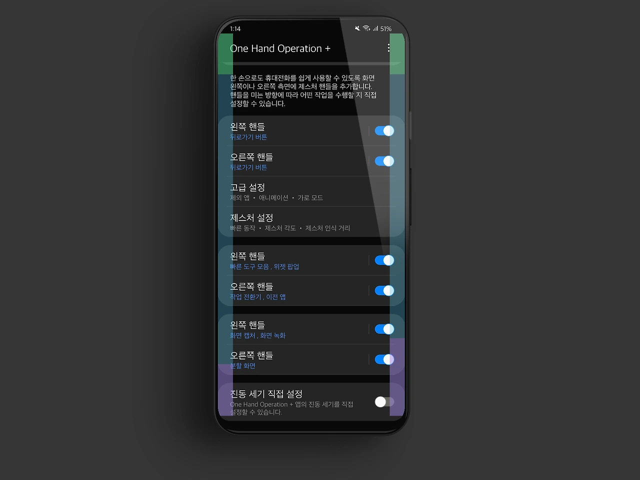 본인도 처음 이 앱을 접했을때는 대각선 제스쳐와 긴 제스쳐 등 계속 설정하다가 괜히 더 복잡하고 불편해지는거 같아 포기하고 몇개월 뒤 다시 들어와 어떻게 하면 원핸오를 직관적이고 편하게 이용할 수 있을까 세팅을 연구했다