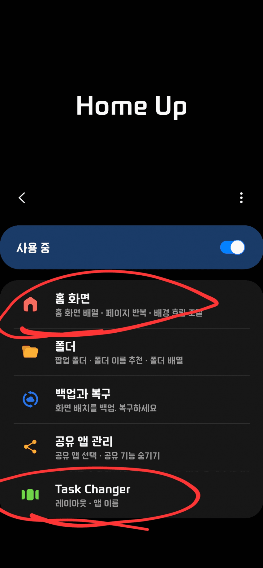 이렇게 터치해서 초록색으로 변하면 적용이 되는거임.