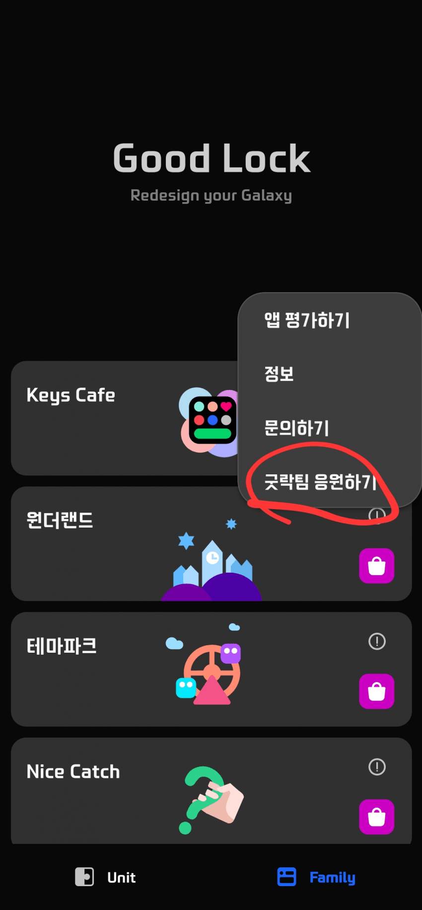 점 3개있는거 누르고 굿락팀 응원하기에 들어가서