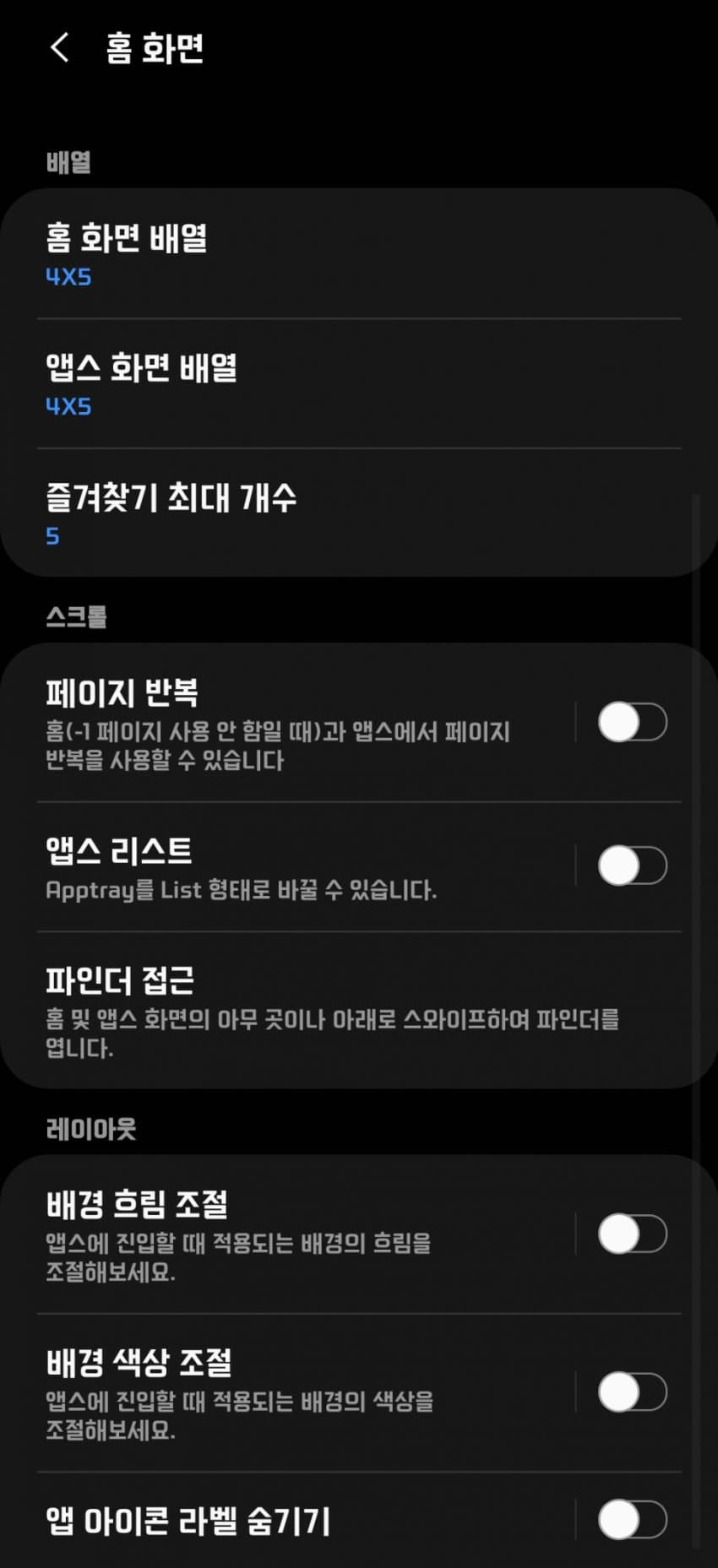 홈화면,앱스 화면 배열이