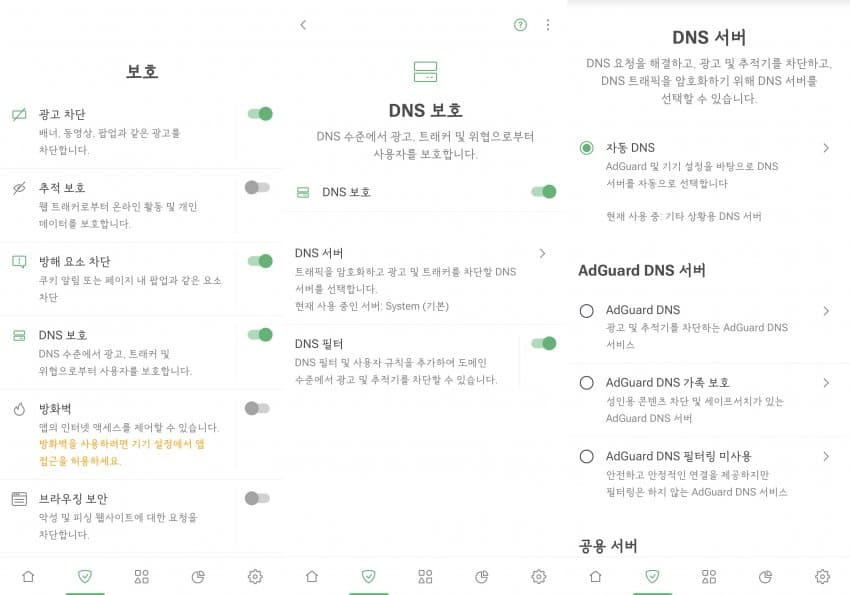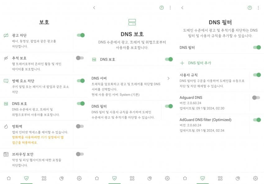 광고 차단, 방해 요소 차단, DNS 보호 제외 전부 꺼라.