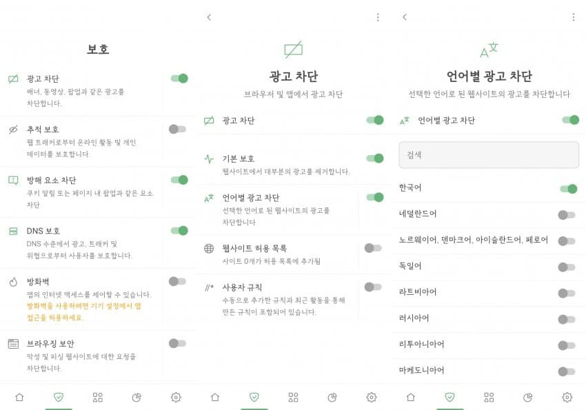 광고 차단, 기본 보호, 언어별 광고 차단만 켜라.