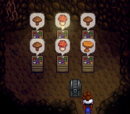 버섯동굴을 선택하면 6개의 통이 주어지고, 약 70%의 확률로 갈색 흔한버섯, 약 12% 확률로 빨간 버섯, 그 외에 낮은 확률로 보라버섯, 살구버섯, 곰보버섯이 나온다.