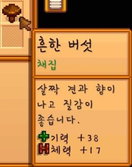 흔한버섯의 회복량은 새먼베리보다 많기 때문에 하루에 약 4개씩 얻는건 기력관리에 큰 도움이 되고, 빨간버섯은 75골드, 고급버섯들은 150/160/250 골드이기 때문에 즉각즉각 팔아치우면 꾸준히 잔돈이 된다.