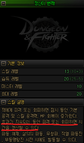 정신이 번쩍 패시브는 특정스킬 사용시 활성화되며 지속시간중 회피나 피격시 지속시간이 갱신되는 패시브스킬임