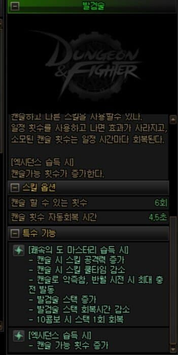 이렇듯 횟수에 제한이 있기 때문에 4.5초당 1회 회복+10콤보 시 스택 1회 회복을 바탕으로 계속해서 발검술 스택을 회복하며 계속 캔슬을 하는게 필수라고 볼 수 있다.