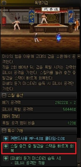 나머지 스킬들은 섬광 반월한테 영양분을 빼앗겼는지 많이 약하다 그래도 채널링이 신경쓰이는 스킬은 폭명기검 뿐이라 무큐기들은 금방 털 수 있기 때문에 괜찮다