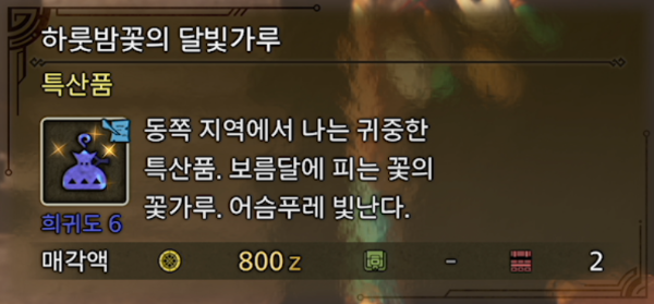 (주의) 보름달이 뜬 시간에만 채취 가능 (기다리기 싫으면 길드 포인트로 휴식하여 시간을 조절하는 방법이 있다고 함)