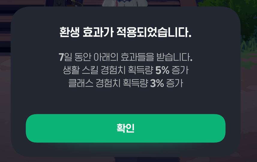 환생 시에는 7일 동안 상기 사진처럼 2가지 효과가 생깁니다. 환생석은 990 캐시 입니다.