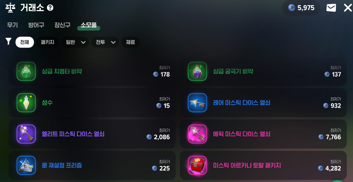 데카 재화로 유저간 거래가 가능한 거래소에서 아이템 구매,판매가 이루어집니다.