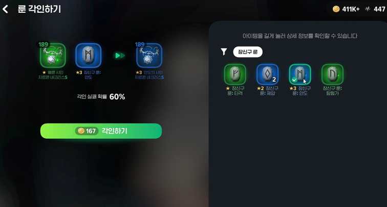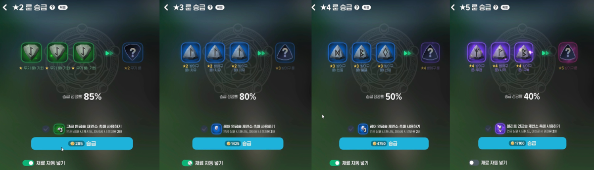 등급에 따라 승급 성공률이 차감 됩니다. 이점 유의 하시고 실패 시에는 룬이 사라집니다.