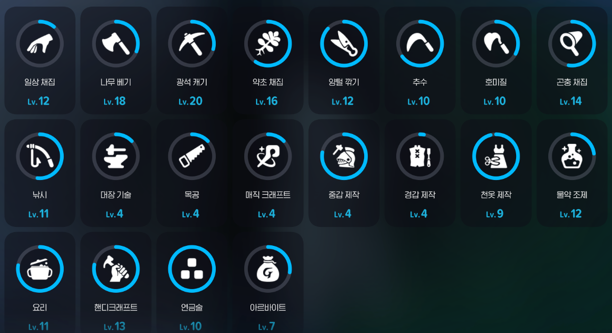 3. 생활 스킬 레벨은 총 20가지 종류로 나뉩니다.