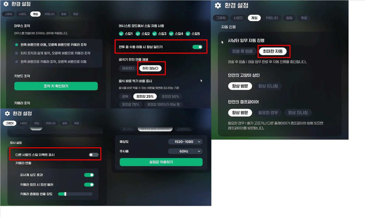 상기 환경 설정 창에 보이는 빨간 테두리는 초반 빠른 진행을 위해 추천드립니다.
