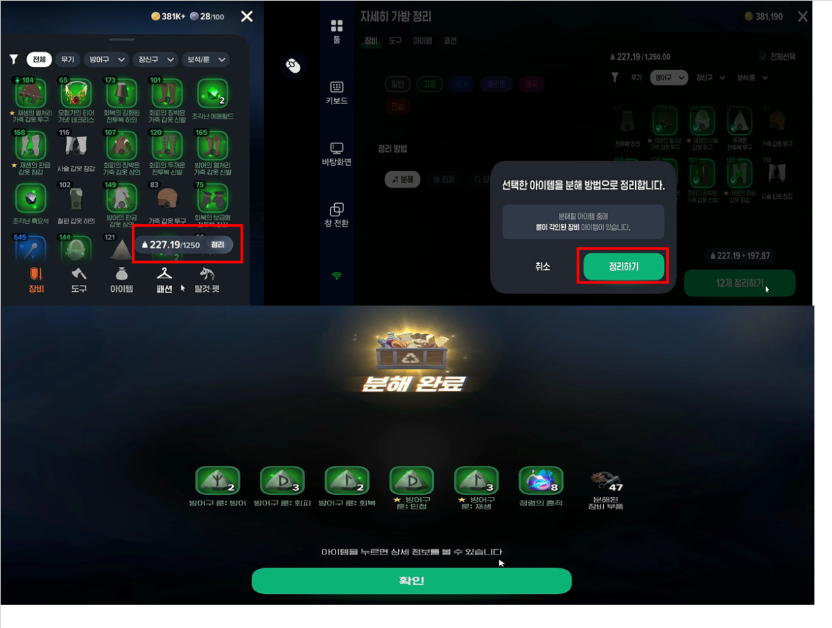 상기 사진 처럼 가방에서 정리하기 버튼을 누른 후 필요 없는 장비를 체크하시어 분해 하시면 됩니다!