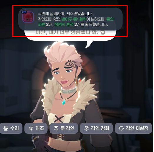 각인이 실패한 경우 상기 사진처럼 아이템이 저주를 받게 됩니다.