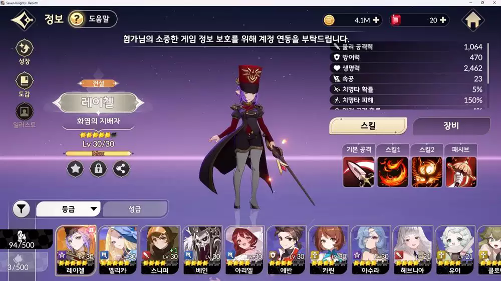 궁극 강화 후 레이첼의 스킬 계수가 크게 높아지고 쿨타임도 짧아져 보스 몬스터를 빠르게 쓰러뜨릴 수 있어요. 범용성이 뛰어나서 언제 어디서나 믿고 쓸 수 있는 영웅이랍니다.