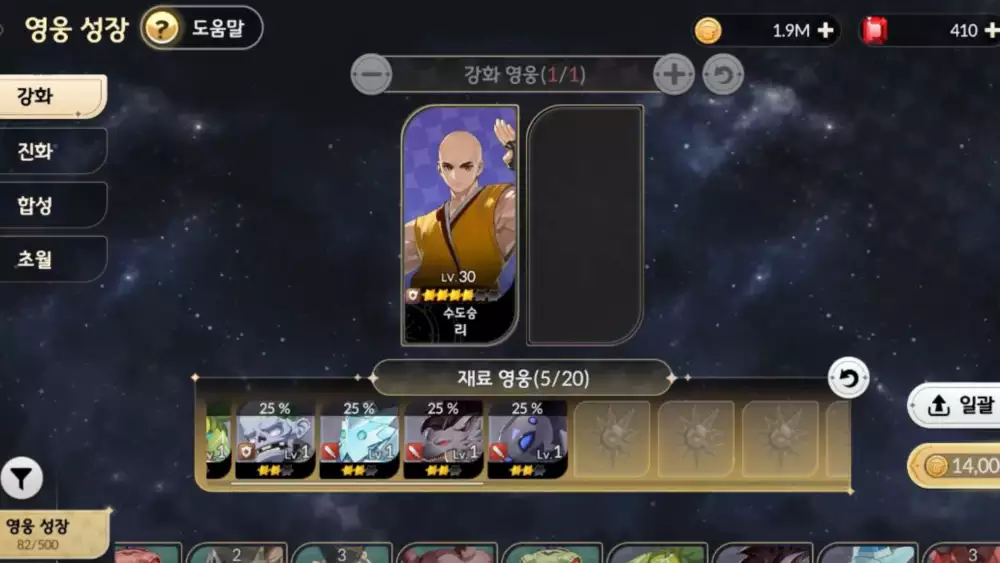 영웅 합성을 하기 위해선 영웅의 레벨도 중요해요. 합성을 할 영웅은 레벨 30까지 키워야 하는데, 이때 꼭 필요한 작업이 바로 쫄작입니다. 쫄작이란 낮은 등급의 영웅을 빠르게 레벨업시키는 방법인데, 주로 반복 전투를 활용합니다. 특히 14영지에서 쫄작을 진행하면 적은 열쇠로 빠르고 효율적인 레벨업이 가능하니 이 방법을 꼭 기억해두세요!