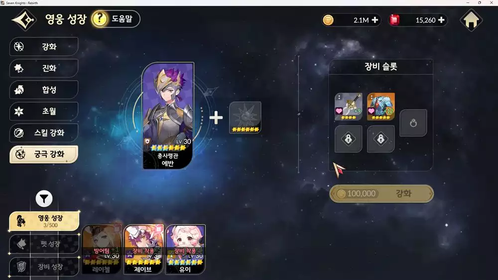 합성을 위해선 영웅을 반드시 +5 강화해야 합니다. 여기서 자원 낭비를 막으려면 두 단계 낮은 등급의 영웅을 강화 재료로 쓰세요! 예를 들어, 3성 영웅을 강화할 땐 1성 영웅을 재료로 사용하는 게 가장 좋습니다. 이렇게 하면 강화에 들어가는 자원을 크게 절약할 수 있어요.