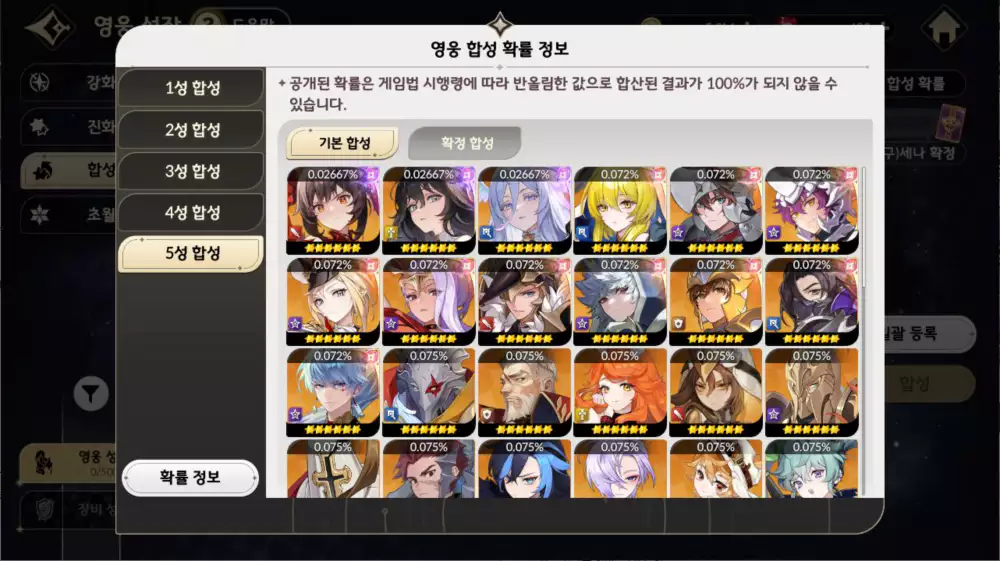 영웅 합성은 간단히 말하면 같은 등급에서 +5 강화한 두 영웅을 합쳐 더 높은 등급의 영웅을 만드는 거예요. 예를 들면, 3성 영웅을 두 개 준비해서 둘 다 +5 강화하면, 이 두 영웅을 합성해서 4성 영웅을 얻는 거죠. 이렇게 차근차근 진행하면 어느새 최고 등급인 전설급 영웅까지 도달할 수 있어요.