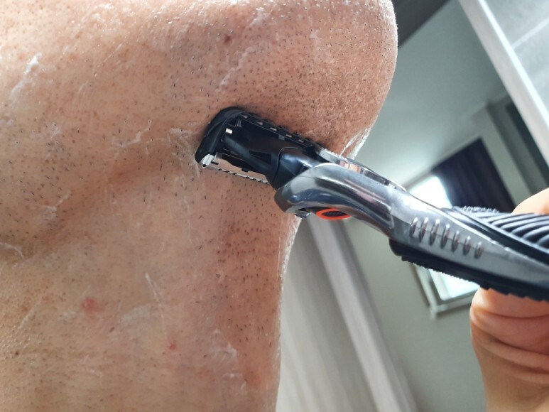 면도기를 직접 턱 선에 가져가면 위에서 말하던 것과 같이 좌우 또는 상하로 면도날이 턱 선에 맞게 면도기가 움직이게 되어 밀착력이 높아집니다. 남자라면 공감할 턱 쪽을 면도할 때 손을 위로 올리면서 라인을 맞추는데 그렇게 하지 않아도 면도를 깔끔하게 할 수 있습니다.