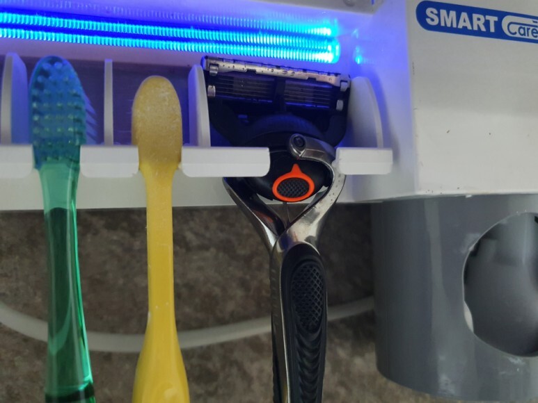 저 같은 경우 칫솔 살균기에 면도기 하나를 살균할 수 있는 곳이 있어서 살균기에 거치해서 남아 있는 물기도 말리고 세균이 생기지 않도록 합니다. 플렉스볼 때문에 안 들어 가지 않을까 걱정했는데 이 살균기는 다행히 면도기를 살균하는데 큰 문제가 없는 것 같습니다.