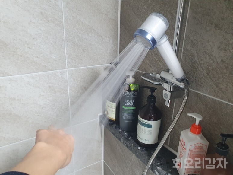 물을 틀고 수압을 한번 느껴보고 있는데 이런 미세홀이 있는 샤워기의 경우 아이들이 샤워할 때 간지러움을 느끼는 경우가 많은데 이 샤워기의 경우 간지럽기보단 부드럽다는 느낌이 맞을 것 같습니다. 물이 손에 닿을 때 정말 부드러움이 느껴지는 것을 느낄 수 있었습니다.