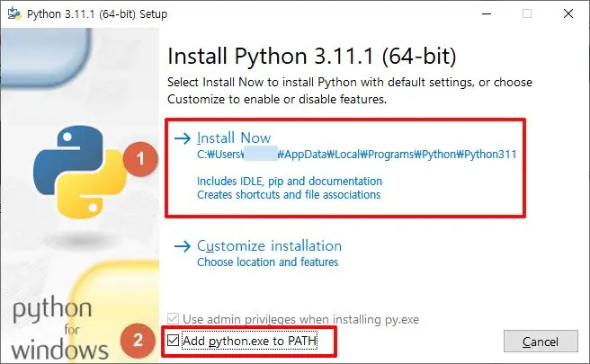 2. 해당 옵션을 선택하면 환경변수 PATH에 파이썬 실행 파일 위치가 등록됩니다. PATH에 등록되면 파일의 전체 경우가 없더라도 파이썬 파일을 실행 할 수 있습니다.